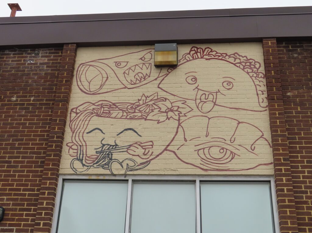 The designs above the windows that haven’t been painted yet show the types of food expected to be offered, such as tacos, ramen, dumplings, and sandwiches.
