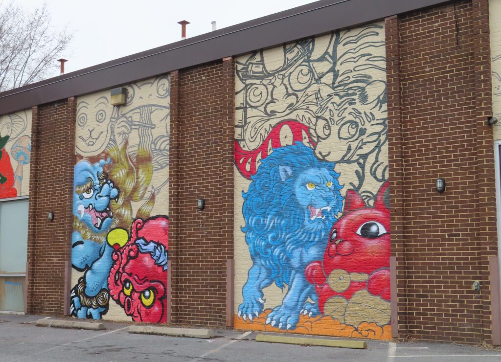 The mural features a blue lion, which is a good-luck symbol in Vietnam; a red rabbit, also representing good luck; a dragon; the Buddha; and a Japanese maneko neko “beckoning cat,” which is often displayed to welcome people to a business.