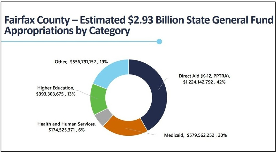 - Total state general fund appropriations benefiting Fairfax County amounted to $2.93 billion. That’s just 11.1 percent of statewide general fund spending. That includes direct aid (such as funds for K-12 schools and personal property tax relief) and indirect aid (such as Medicaid, public health, social services, and higher education).