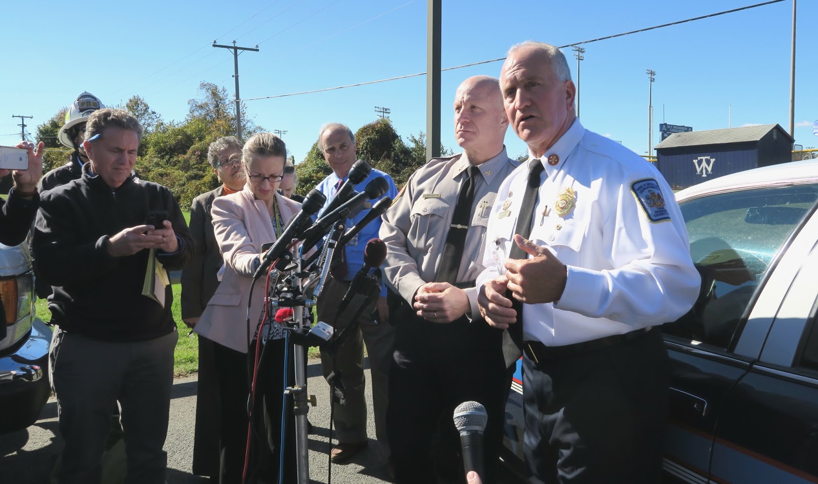 | Fire Chief Richard Bowers (right) briefs reporters. Next to him is Police Chief Edwin Roessler. |