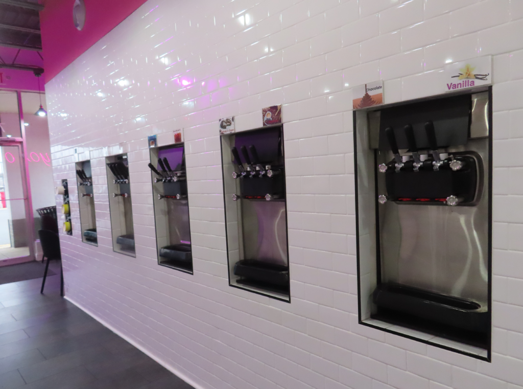 Fro-yo flavors currently on tap include strawberry, mango, horchata, dulce de leche, taro, cookies and crème, acai, espresso, chocolate, and vanilla. Some of the flavors will be rotated every week.