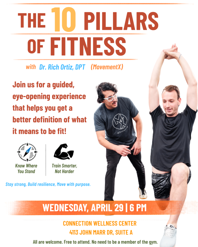 Next Wednesday, April 29, at 6 p.m., we’re hosting a special presentation at the Connection Wellness Center in Annandale with physical therapist Dr. Rich Ortiz from MovementX on “How to Stay Strong, Build Resilience, and Stay Active for the Long Game.” And you guessed it – He will be covering those 10 pillars of fitness in much more detail.