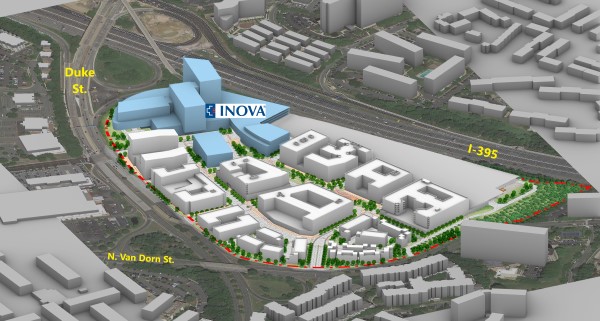 The 52-acre site will be anchored by a new Inova Health System hospital, which will replace the existing Inova Alexandria Hospital on Seminary Road.