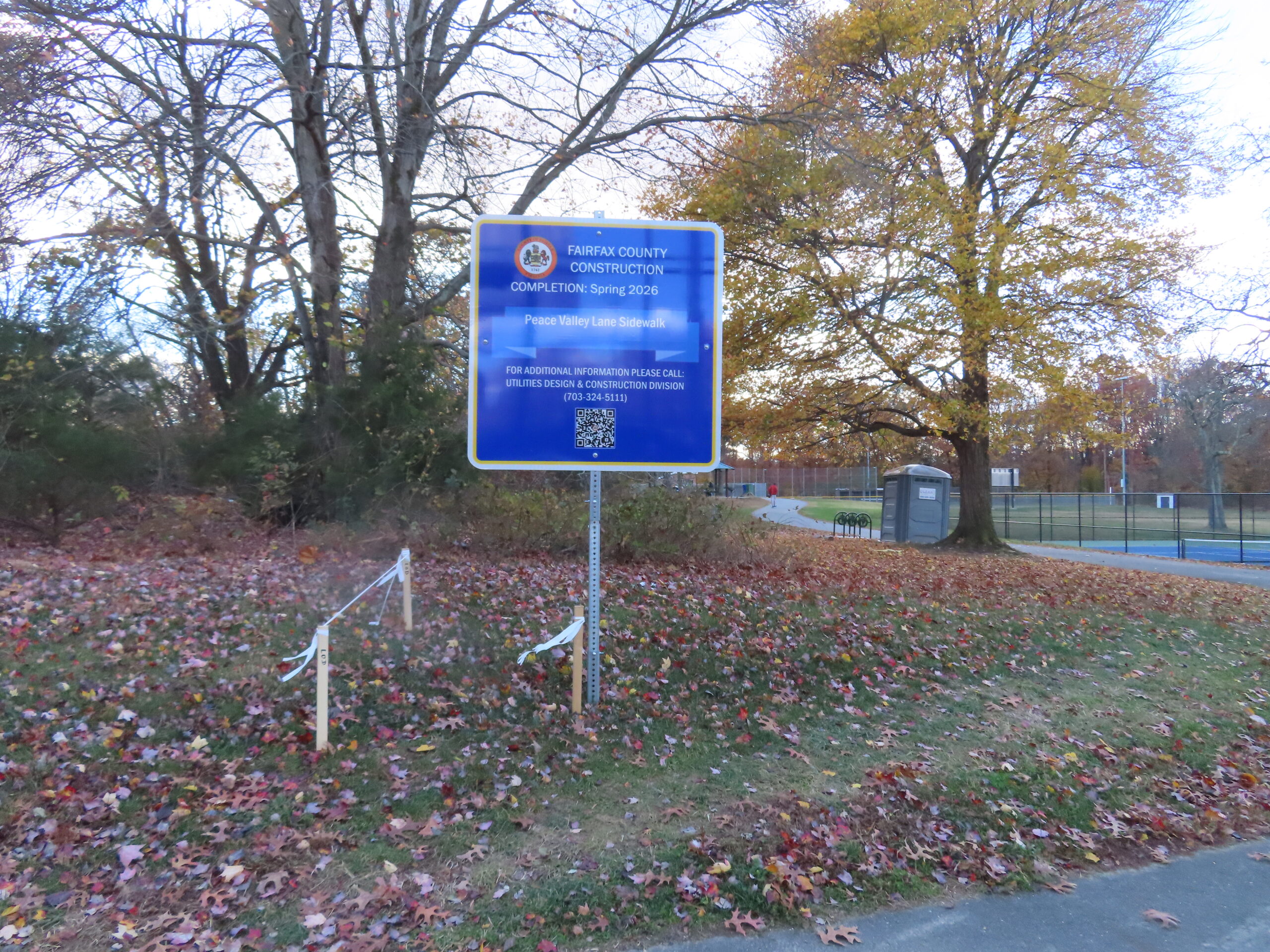 The sign and stakes are up at Justice Park in preparation for the construction of a sidewalk along Peace Valley Lane. The $900,000 project calls for 825 linear feet of a five-foot concrete sidewalk between Mansfield Road and the cul-de-sac at Peace Valley Lane in Seven Corners. The project is aimed at accommodating pedestrians going … Continued