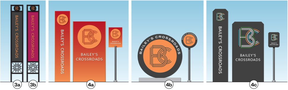 For the Bailey’s Crossroads signs, options 3a and 3b have two symbols: a decorative shape that symbolizes “crossroads” and a monogram of an intertwined “B” and “C” done in stripes reflecting the convergence of roads. 4a, 4b, and 4c just have the monogram.