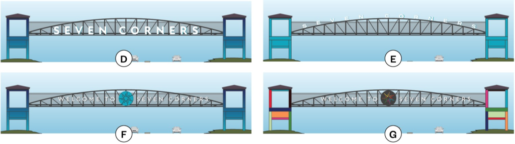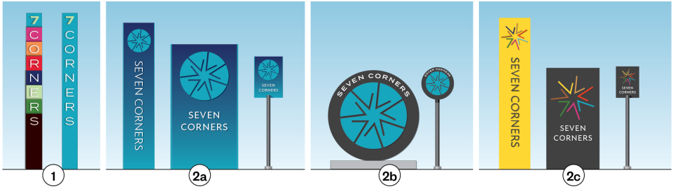 Among the concepts for Seven Corners, option 1 is based on the original sign for the Seven Corners Shopping Center, with each letter on a separate layer. “The layering effect represents the idea that we’re lots of things coming together,” Hoffman said.
