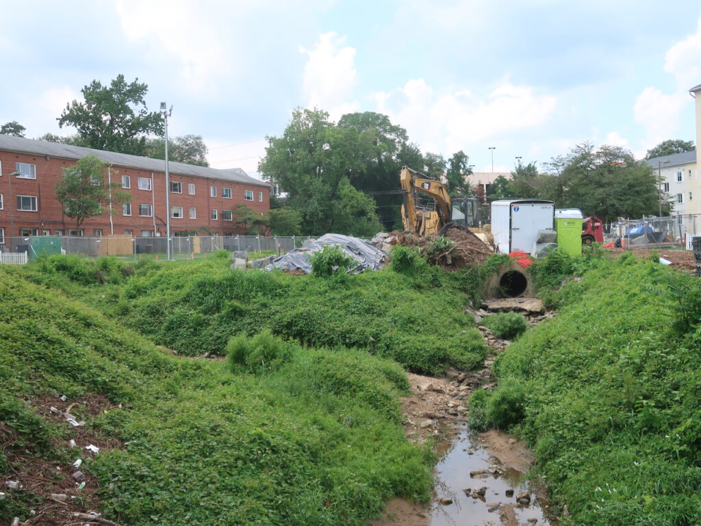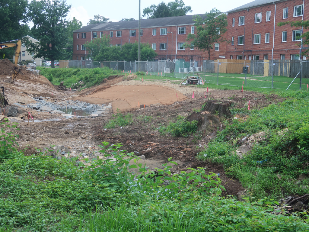 The site is challenging, Shepherd says. The stream is very close to the garden apartments and underground and above-ground utility lines, which made it difficult to get the equipment in there.