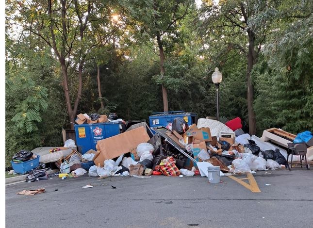 | Overflowing trash in the parking lot. |