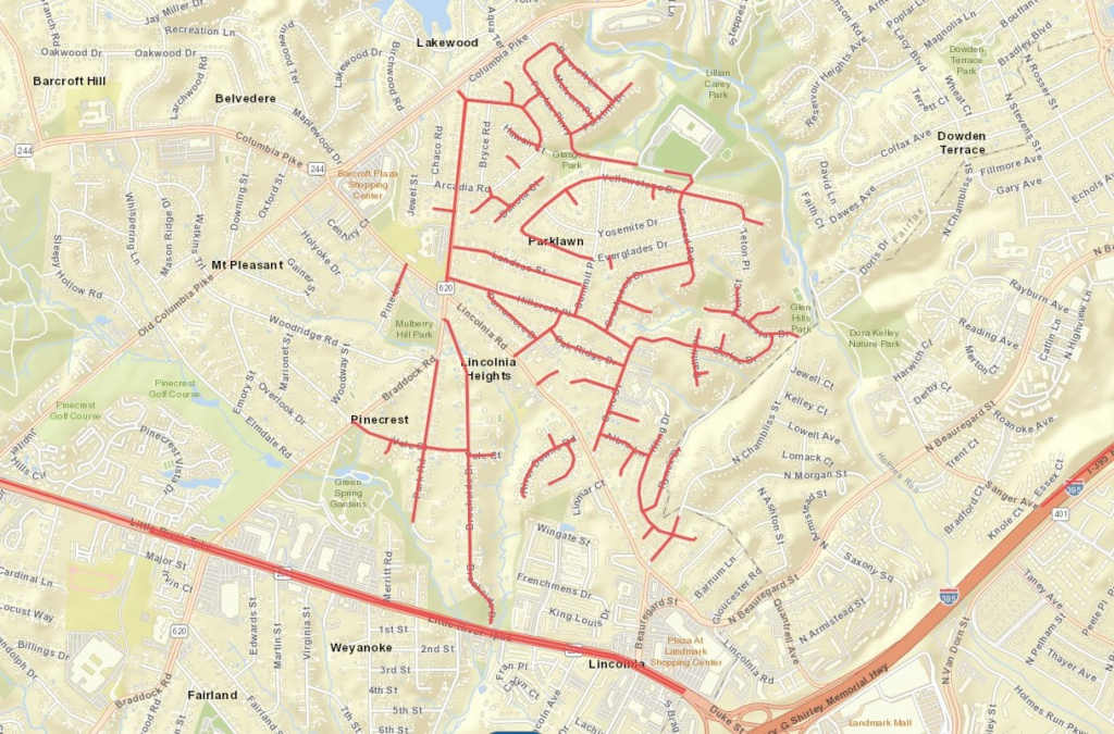 - Many other streets in Lincolnia, including Brookside Drive, Park Road, Yellowstone Drive, Fairfax Parkway, Arcadia Road, Oak Ridge Drive, River Downs Road, and N. Chambliss Street.